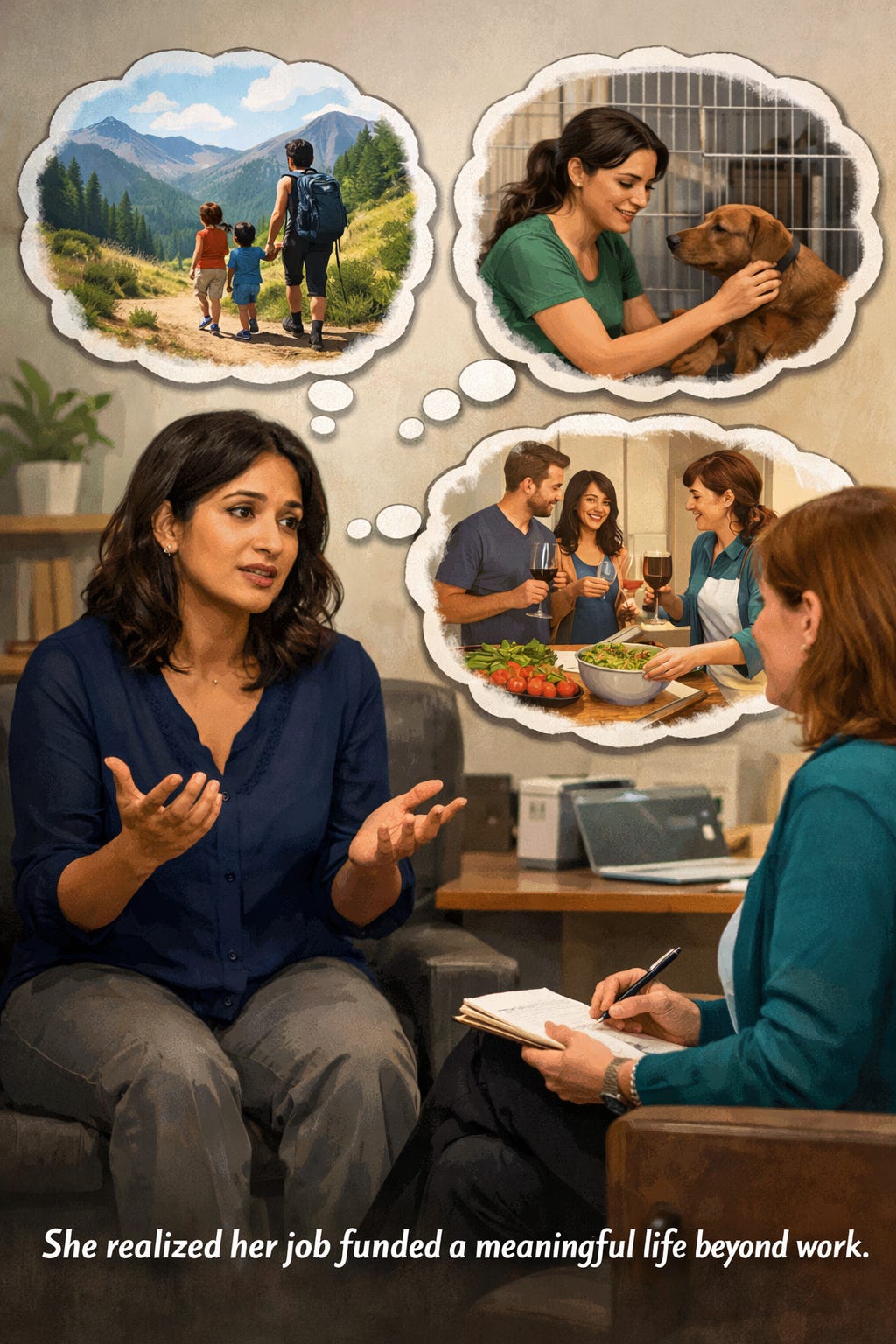 Maya, a 34-year-old accountant, told her coach, “I sit at my desk and think, ‘None of this matters.’ I feel like I’m wasting my life.” Her coach acknowledged her despair and then invited her to widen her lens by asking: “What parts of your life do feel alive, or even just slightly meaningful?” Maya mentioned hiking with her kids, cooking for friends, and volunteering at an animal shelter. Her coach gently highlighted how much meaning she was already making outside of work. Together, they discussed how to cherish these dimensions more fully. Maya realized her job could be understood as the platform that funded a meaningful life, rather than its primary source of purpose.